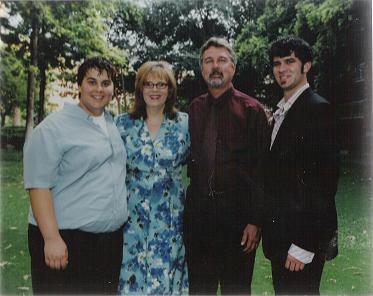 Me, my wife Cathy, and my two boys: Ben (on my left) and Tim (on Cathy's right). This was taken at my folk's 50th wedding anniversary, about 7 years ago. |